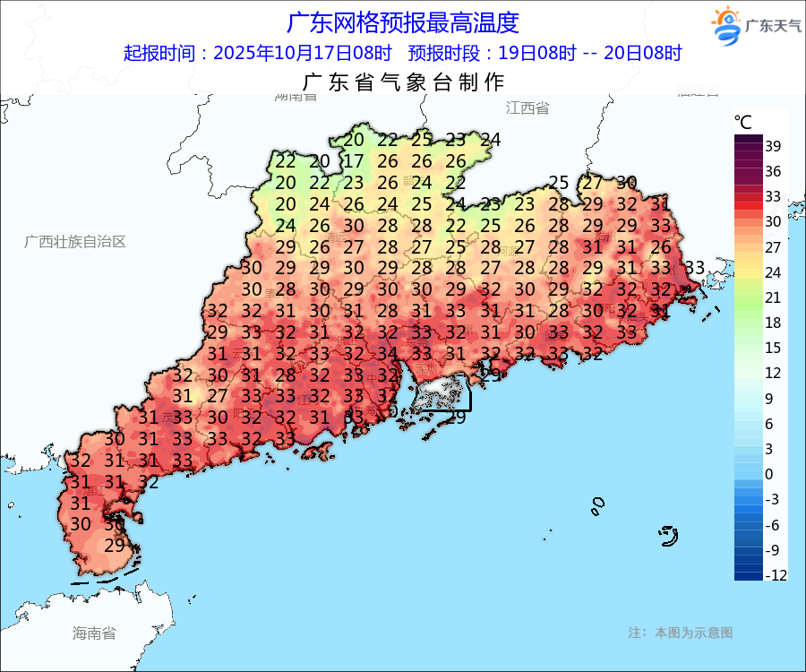 19日:清远北部和韶关北部22~27℃,粤北其余市县和珠三角北部市县28~31℃,其余大部市县31~33℃。