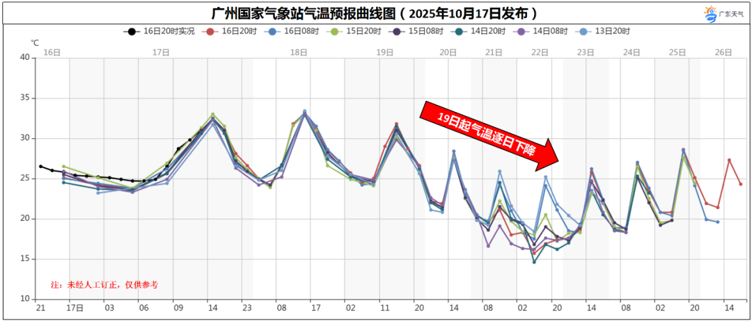 气温方面,19-22日,中等强度冷空气持续补充影响,广东气温自北向南逐日下降,过程降温6~10℃,最低气温将出现在22日或23日早晨。以广州为例,22日(周三)最高气温23℃左右,最低气温18℃左右,体感清凉,尤其是晨晚时段。