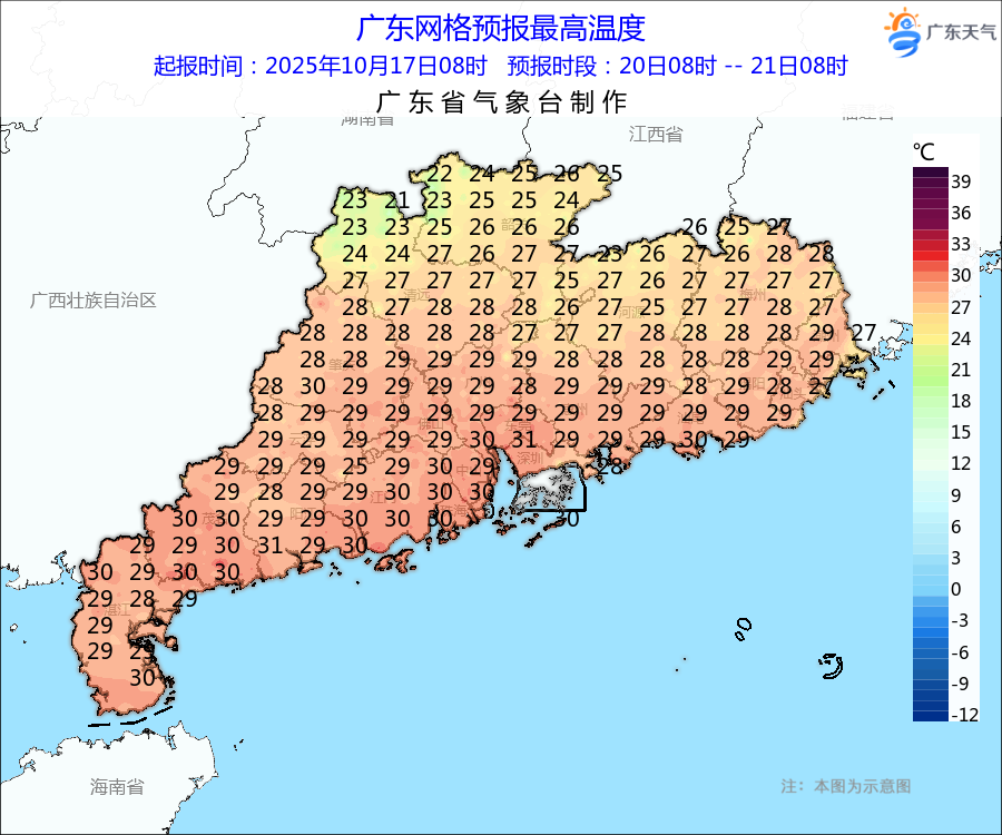 20日:清远北部和韶关北部19~24℃,粤北其余市县和珠三角北部市县25~28℃,其余大部市县28~30℃。