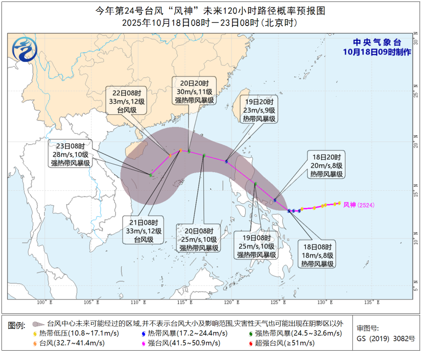 大风预报:受冷空气和“风神”的共同影响,18日08时至19日08时,台湾海峡、巴士海峡、南海北部将有6-8级、阵风9-10级的大风。