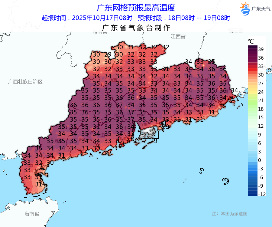 18日:韶关北部和清远北部市县27~30℃,粤北偏北其余市县和粤西沿海市县30~32℃,其余市县33~35℃。